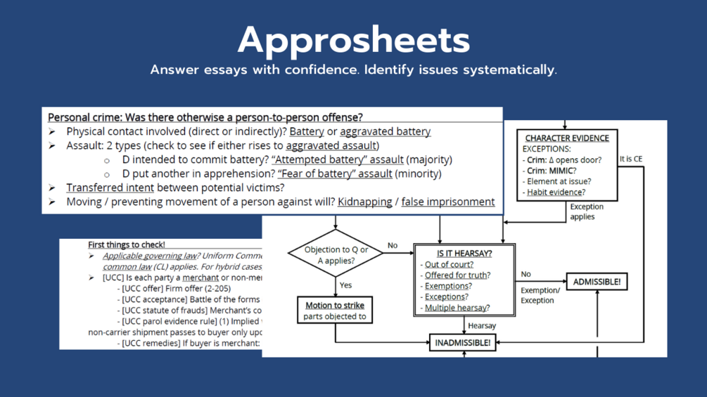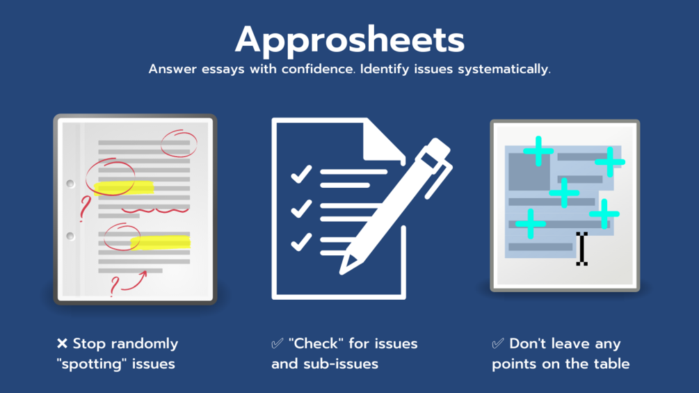 Approsheets are essay attack checklists and flowcharts β€” roadmaps to help you approach each essay, see the relevant issues and sub-issues, and collect hidden points.